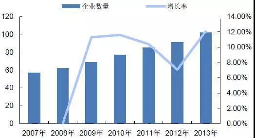 2007-2013年我國機器視覺企業(yè)數(shù)量及增速