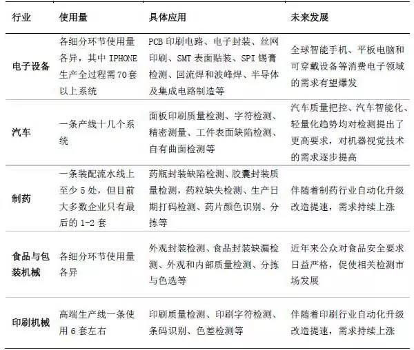工業(yè)機器人領(lǐng)域的機器視覺下游市場主要是半導(dǎo)體及電子制造、汽車、食品與包裝和制藥行業(yè),其他如煙草、農(nóng)業(yè)、機械零部件等也是機器視覺應(yīng)用的重要行業(yè)。