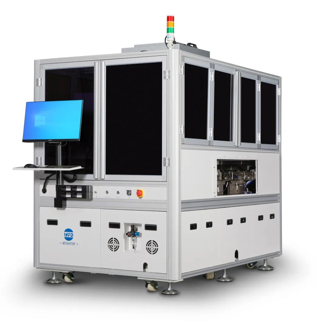 Mini/Micro LED WFD8970B高效率固晶機(jī)是公司本年度最具競(jìng)爭(zhēng)力的一款機(jī)型,在保證客戶端產(chǎn)品精度及設(shè)備長(zhǎng)期工作精度穩(wěn)定的條件下,單臺(tái)設(shè)備擁有較高的產(chǎn)能,領(lǐng)先于Mini LED封裝設(shè)備行業(yè)。設(shè)備邦頭擺臂吸嘴帶旋轉(zhuǎn)功能,結(jié)合底部飛拍視覺(jué)算法,可對(duì)吸取后的芯片進(jìn)行角度精確修正;設(shè)備采用高速、高精度的取晶及固晶平臺(tái),具備真空漏吸晶和XY自動(dòng)修正功能,可識(shí)別晶片的R、G、B極性,單臺(tái)WFD8970B設(shè)備即可完成單色混打或RGB三色固晶,便于客戶端驗(yàn)證產(chǎn)品及自動(dòng)化聯(lián)線生產(chǎn);自主創(chuàng)新的夾持換晶環(huán)機(jī)構(gòu)(已申請(qǐng)發(fā)明專利),可實(shí)現(xiàn)5S以內(nèi)換一次晶環(huán),提高混打的效率。WFD8970B在基于多約束條件下的高效率混打工藝算法,能很好的解決客戶端產(chǎn)品點(diǎn)亮亮度不均勻的問(wèn)題。目前,單臺(tái)WFD8970B客戶端生產(chǎn)全測(cè)有效產(chǎn)能為UPH 75K(開(kāi)PR、底部飛拍、固后檢測(cè)),在編入混打工藝,單機(jī)實(shí)測(cè)產(chǎn)能UPH 65K(混打、開(kāi)PR、底部飛拍、固后檢測(cè)),領(lǐng)先同行30K以上,具備較高的性價(jià)比。