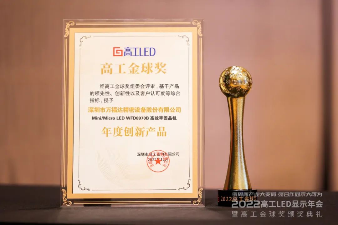 萬(wàn)福達(dá)作為優(yōu)秀的Mini LED智能制造裝備供應(yīng)商,受邀出席本次大會(huì),公司的WFD8970B高效率固晶機(jī)憑借其領(lǐng)先性、創(chuàng)新性以及客戶認(rèn)可,獲得了本次高工盛會(huì)的“年度創(chuàng)新產(chǎn)品”高工金球獎(jiǎng)。